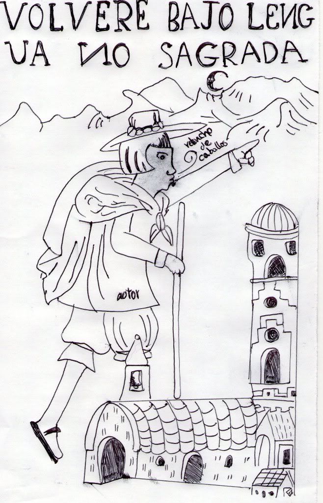 El primer elemento a notar es la imagen del hombre  viajando. Sin duda se trata del autor de la Requetenueva, los elemenos que permiten identificarlo son varios: 1) el lema de la imagen “Volveré bajo lengua no sagrada” nos recuerda la promesa que hizo a sus súbditos del sur, del Perú, antes de partir. El autor es muy claro en ese punto, a pesar de mantener el anonimato quiere dejar claro su papel como autor, autoridad, del texto. La imagen nos recuerda a la figura de Huamán en la ilustración de su Primer Corónica en el capítulo “Del mundo bvelbe el avtor”. La imagen, encabezada por “Camina el avtor” (pág. 1009) nos muestra al autor en su viaje, caso análogo al del autor de nuestra Requetenueva. Huamán se define en dicha imagen con la pequeña  leyenda (autor) en la ilustración de arriba también encontramos. El encabezado de la ilustración hace referencia a los versos 25-26. EL autor parece señalar su viaje a México desde Perú, o al menos eso parece indicarnos el hecho de que la ciudad que parece abandonar sea Lima (Huamán, 950)